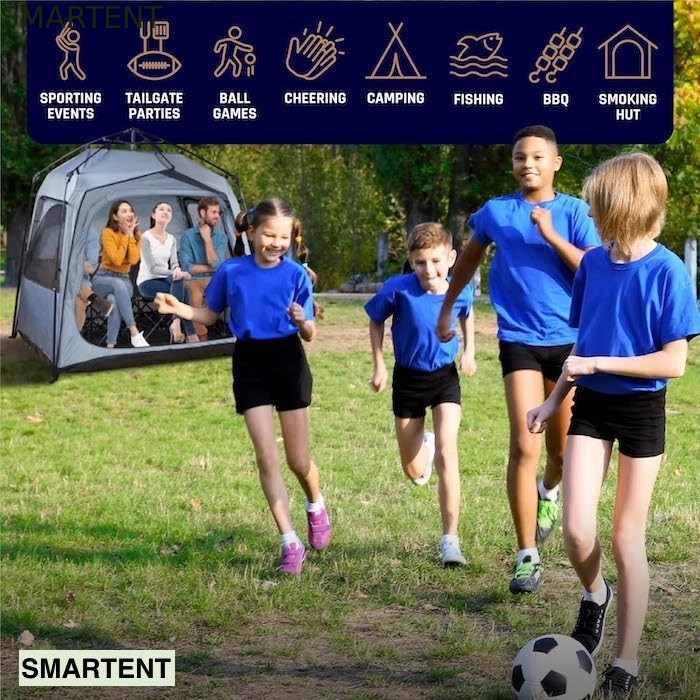 | Key Features | - ⚡ 1 minute setup - This super portable sports weather tent is built quickly with an automatic frame. Disassembly is just as easy, no need to wrestle the tangled wires. Clear and easy to understand instructions are sewn directly into the oversized tote bag. It weighs only 10 pounds and is easy to carry. Easy to pack and carry All-weather protection - use our enclosed seating tents to keep away from the sun, rain, cold and wind. Cheer on your team in the warm and cozy pop-up shelter. Our pop-up sports pods will no longer freeze fingers and toes, cold, wet muddy clothes or drain from heat. ✈️ PACK & GO: This sports pod tent provides convenient and lightweight shelter for your child's soccer, soccer, volleyball and other outdoor games. Easy to carry and set up, it provides a comfortable and protected venue where you can cheer on young athletes no matter the weather. With our outdoor sports tent, you can focus on the game and enjoy every moment, knowing you're covered! One tent, many uses - the largest sports pod you can buy, suitable for sports and inflatable tents. It is a great sports parent tent with enough space for 2 chairs or even benches for 4 people. When outdoor sporting events go on for a long time, you'll really enjoy the extra leg room in our spectator tent. There's room for the whole family, so sit back, relax, and enjoy the game. Space for all staff - Enjoy space to stretch, stand and move, using your personal exercise shelter. No more trouble in the sun - this tent is versatile as it offers a chunky transparent EVA window that resists wrinkles, allowing you to see the action 270 degrees clearly from the pop-up weather shelter. High-end polyester fabric, double-thread stitching, seamless bathtub waterproof flooring and oversized zippers make the tent a durable investment |